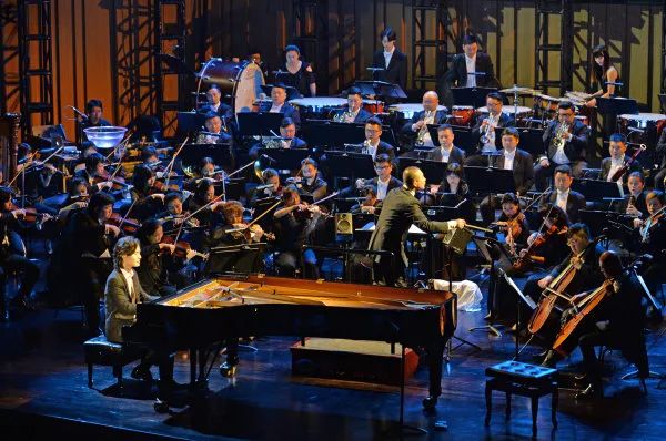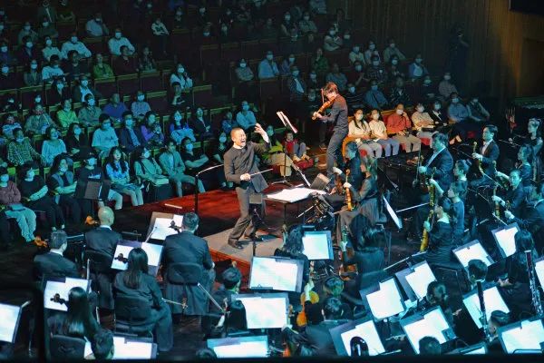 5月1日晚,长沙音乐厅,谭盾与长沙交响乐团在演绎音像剧《武侠三部曲》。 湖南日报·新湖南客户端记者 李健 摄