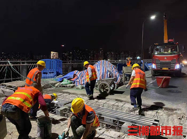 为减少对交通的影响,大部分道路施工安排在晚上进行。6月13日晚间,记者在三一大道波隆立交桥路段看到,施工人员正在对路面进行铣刨。银盆岭大桥上,施工人员正对桥梁伸缩缝进行更换。