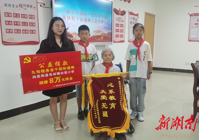 今年90岁的孙瑾琳毕生节俭,1949年8月进入税务系统从事基层工作,一直勤勉律己,宽以待人,兢兢业业。1986年离休后,她依旧心系国家税收事业,1993年被评为全省税务系统离休干部先进个人。今年党史学习教育开展以来,孙瑾琳每天都温习党史,于6月21日递交入党申请书。今天,她捐出几乎全部积蓄30万元,用以帮困助学、保护长江生态和关爱脑瘫儿童,献礼党的百年华诞。