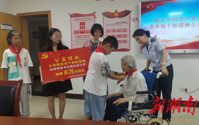 湖南日报·新湖南客户端6月26日讯(记者 周磊 通讯员黎牧)今天上午,在国家税务总局岳阳市岳阳楼区税务局离休税干孙瑾琳公益捐赠仪式上,受捐方岳阳县毛田镇白若小学的五年级学生付梓腾为老人系上红领巾,行少先队员队礼,以示感谢。孙瑾琳笑逐颜开,回以队礼。