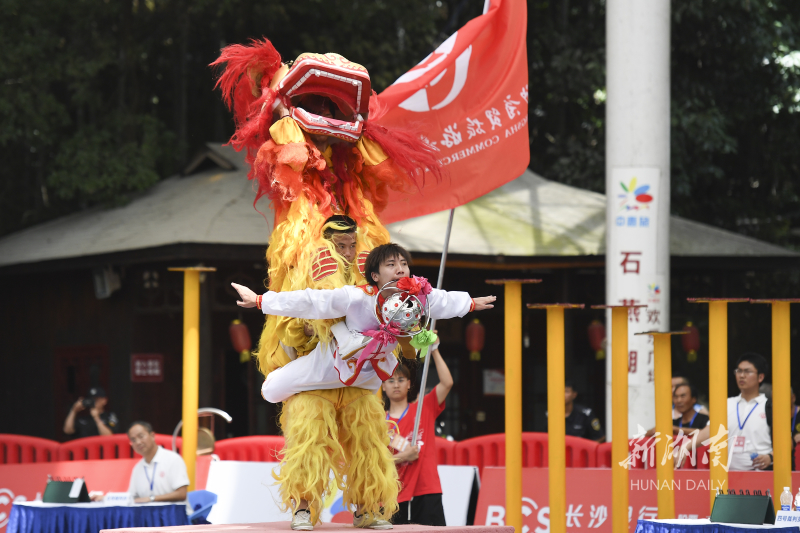 6月14日,选手在进行舞狮比赛。当天,2021“红色庆典”长株潭中华传统体育国际锦标赛总决赛在长沙石燕湖举行。赛事设舞龙、舞狮、鼓艺、高桩南狮等项目,吸引了长沙、上海、福州、重庆等国内队伍以及留学生队伍参赛。湖南日报·新湖南客户端记者 辜鹏博 摄