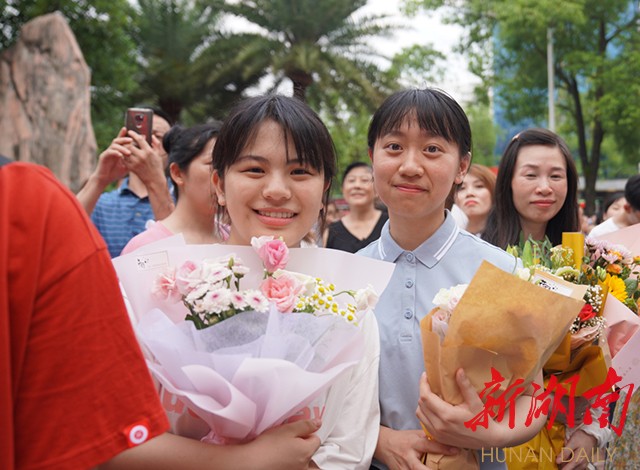 6月9日18:30,在怀化湖天中学,小曾(中)和同学小卢考完生物后,收到了姐姐(右一)送的礼物——明星画册。姐姐对她承诺,只要她好好学习,努力备考, 就送她画册。(记者 雷鸿涛)
