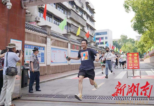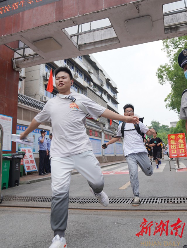 6月9日下午,怀化三中门口,考完政治后,考生飞奔跑出考场。(潘炳蓉 摄)