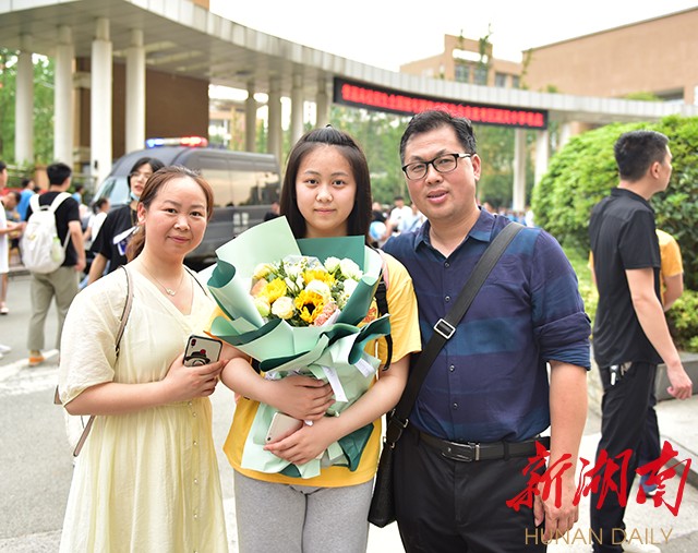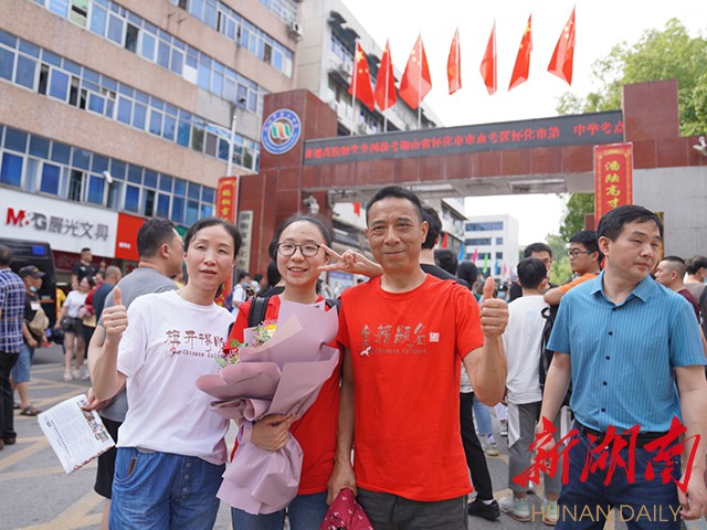 6月9日下午,怀化三中门口,考完政治后,考生跟家长合影留念。( 潘炳蓉 摄)