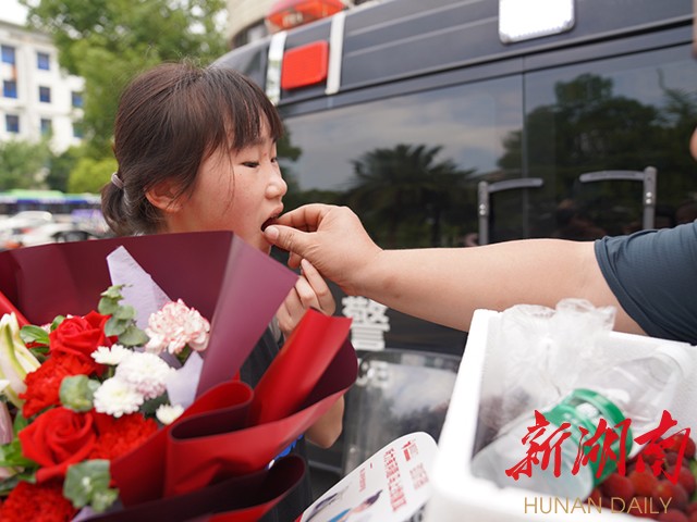 6月9日下午,怀化三中门口,考完政治后,从广西远道而来的家长唐国荣(音)等候女儿多时,并亲手喂上自己准备好的冰镇杨梅。女儿小唐高兴地说:“考得还行,杨梅好甜。”(记者 雷鸿涛 通讯员 潘炳蓉 )