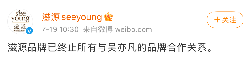 7月19日10时,滋源seeyoung发布微博表示:滋源品牌已终止所有与吴亦凡的品牌合作关系。