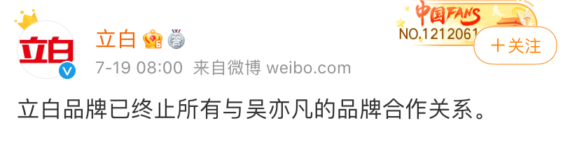 7月19日8时,立白发布微博称,立白品牌已终止所有与吴亦凡的品牌合作关系。
