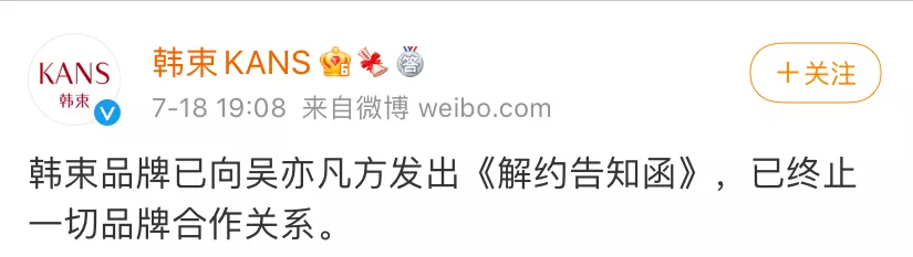 7月18日19时,韩束KANS发布微博称,韩束品牌已向吴亦凡方发出《解约告知函》,已终止一切品牌合作关系。