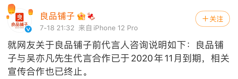 7月18日21时,良品铺子在微博表示:就网友关于良品铺子前代言人咨询说明如下:良品铺子与吴亦凡先生代言合作已于2020年11月到期,相关宣传合作也已终止。