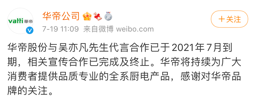 7月19日11时,华帝公司发文称华帝股份与吴亦凡先生的代言合作已于2021年7月到期,相关宣传合作已完成及终止。