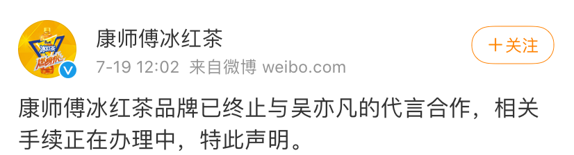 7月19日12时,康师傅冰红茶在微博宣布,已终止与吴亦凡的代言合作,相关手续正在办理中。