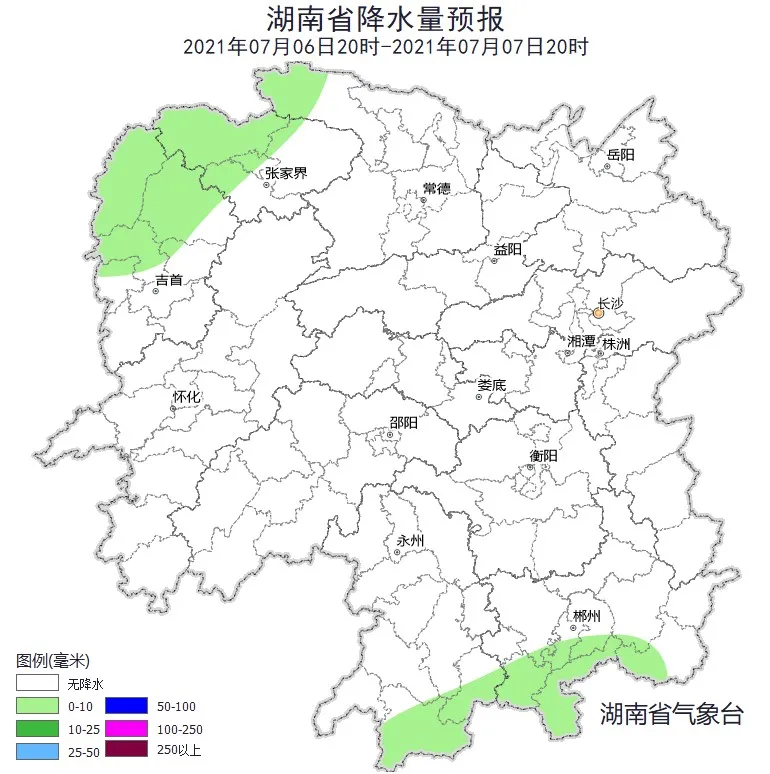 7月6日20时至7日20时,张家界西部、湘西州北部、常德北部、永州南部、郴州南部多云间晴天,局地有阵雨或雷阵雨,其他地区晴天间多云;南风2~3级;最高气温湘西北33~35℃,其他地区34~36℃;最低气温湘西24~26℃,其他地区27~29℃。
