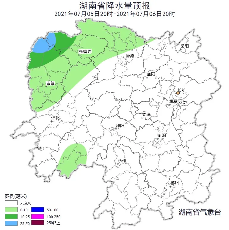 7月5日20时至6日20时,湘西州、张家界、怀化北部、常德北部多云有小到中等阵雨或雷阵雨,龙山、桑植、永顺局地大雨,其他地区晴天间多云,邵阳南部局地有阵雨或雷阵雨;南风2~3级;最高气温湘西北31~33℃,其他地区34~36℃;最低气温湘西24~26℃,其他地区27~29℃。