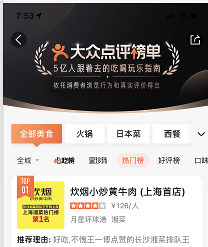 5月28日,炊烟登顶上海大众点评美食热门榜第一;