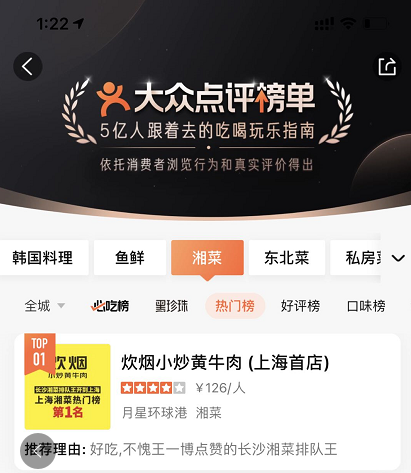 试营业2天,5月3日炊烟登上上海大众点评湘菜热门榜第一;