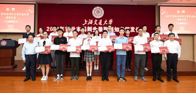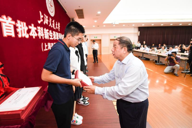 这位来自七宝中学的小伙子被上海交大工程力学专业录取,尽管还未到注册入学的时候,他和首批本科新生今天(7月5日)已经提前向学校“报到”。因为,上海交通大学校长林忠钦院士、常务副校长丁奎岭院士以及六大强基计划学院负责人等专家,在闵行校区为他们送上了录取通知书。
