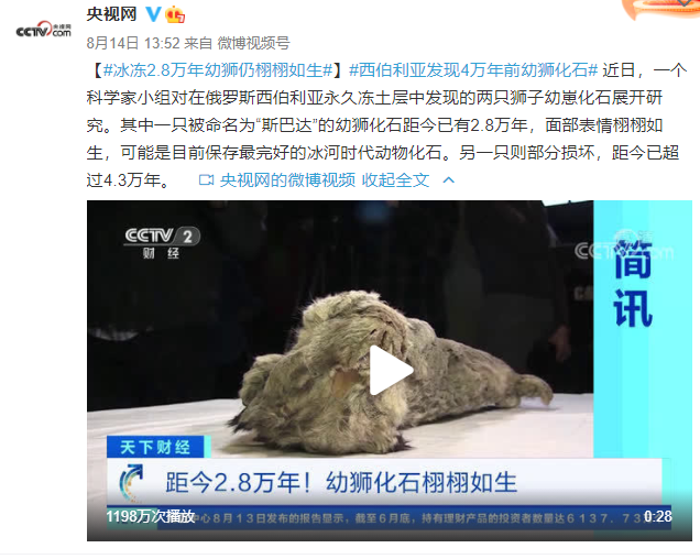 近日,一个科学家小组对在俄罗斯西伯利亚永久冻土层中发现的两只狮子幼崽化石展开研究。其中一只被命名为“斯巴达”的幼狮化石距今已有2.8万年,面部表情栩栩如生,可能是目前保存最完好的冰河时代动物化石。另一只则部分损坏,距今已超过4.3万年。