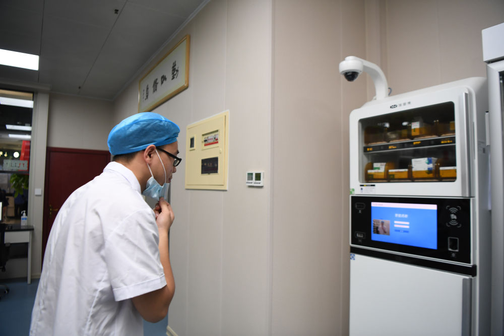 8月11日,长沙市第一医院的医务人员在门诊智慧药房通过人脸识别从麻醉药品智能化管理系统中取药。