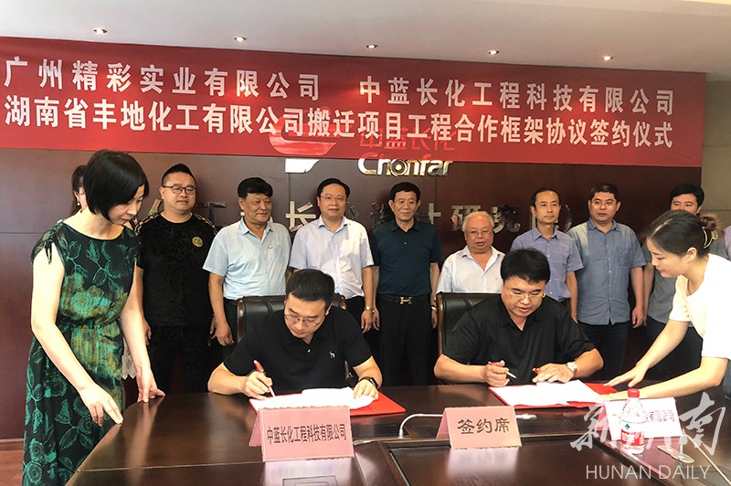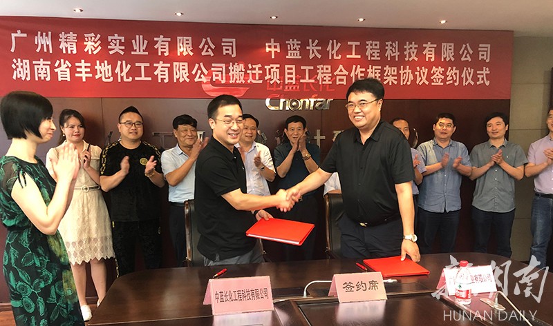 新湖南客户端8月26日讯 今天,广州精彩实业有限公司和中蓝长化工程科技有限公司就湖南省丰地化工有限公司搬迁建设项目合作举行了签约仪式。新化县县委常委、副县长邹谊翔、副县级干部段子剑及其他县领导出席并见证签约。广州精彩公司董事长刘会根、常务副总经理江万春及公司高管团队,中蓝长化副总经理廖鹏飞、总经理助理杨官涛等人出席签约仪式。