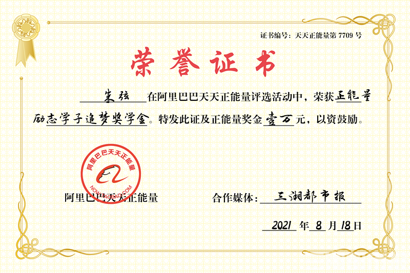 8月18日,三湘都市报联合阿里巴巴天天正能量,为朱弦颁发了一万元正能量励志学子追梦奖学金,并授予她“阿里巴巴正能量校园大使”称号。