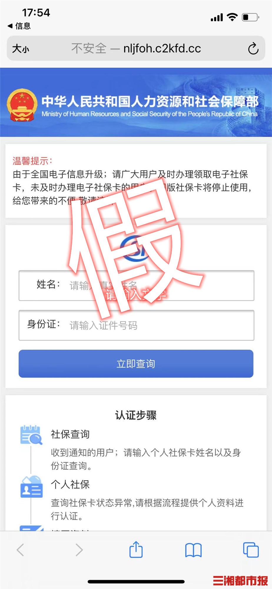 “整个页面看起来还挺像那么回事,但仔细甄别会发现网址上方有‘不安全'的提醒字样。”黄小姐告诉三湘都市报记者,出于防骗意识她没有再进一步操作,但也不确定是否真的会影响到社保卡使用。
