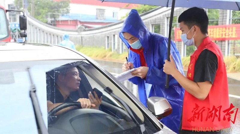 在和平桥疫情防控卡点现场,大雨如注,周树青和队友刘登新穿着雨衣,忙着对来往车辆进行信息登记和体温测量,雨滴打落在脸上,浸湿了鞋子,但他们仍忙碌在工作当中。
