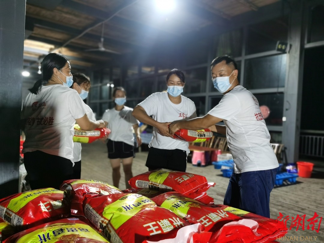 8月12日深夜,彭南科(右一)和“盒饭小组”成员一起,搬运第二天要用的大米。