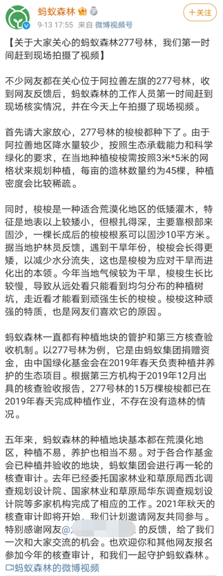 滑动查看蚂蚁森林回应全文 ↓