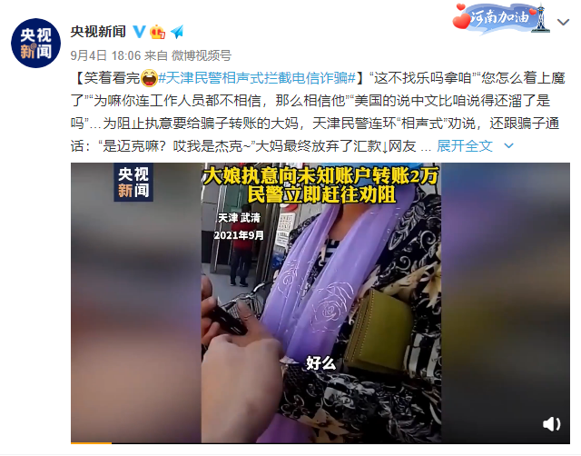 “这不找乐吗拿咱”“您怎么着上魔了”“为嘛你连工作人员都不相信,那么相信他”“美国的说中文比咱说得还溜了是吗”……为阻止执意要给骗子转账的大妈,天津民警连环“相声式”劝说,还跟骗子通话:“是迈克嘛?哎!我是杰克~”大妈最终放弃了汇款。网友:天津人人都说相声实锤。