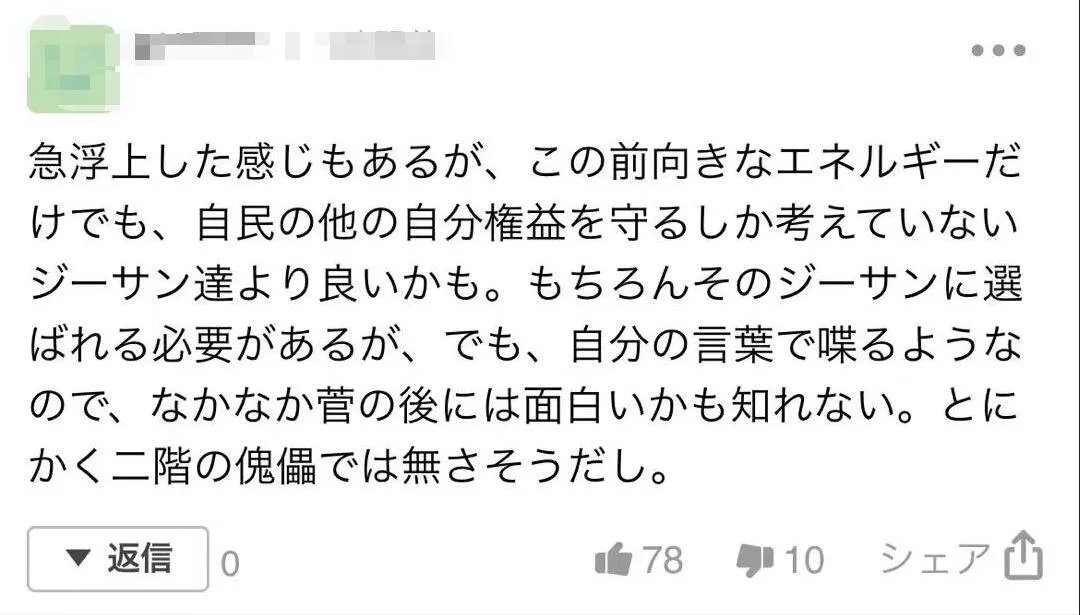 “虽然给人一种急速上升的感觉,但仅凭这种积极向上的能量,就比只顾维护自己利益的那些自民党老头子们要好。当然,她首先得被那些老头子挑中才行。”