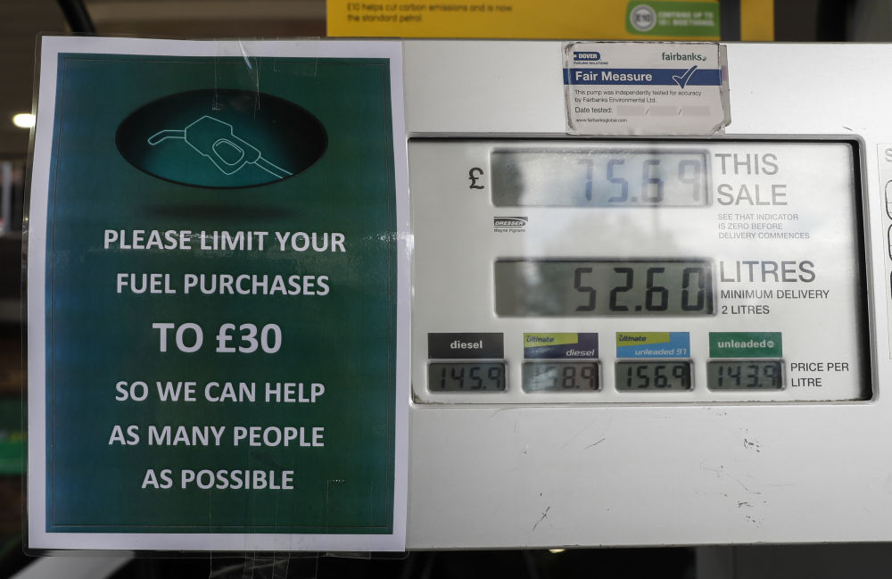 ↑9月27日,英国伦敦一家加油站的加油机上贴着每人限购最多30英镑燃油的告示。