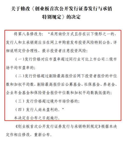 《特别规定》第八条修改为,采用询价方式且存在以下情形之一的,发行人和主承销商应当在网上申购前发布投资风险特别公告,详细说明定价合理性,提示投资者注意投资风险。