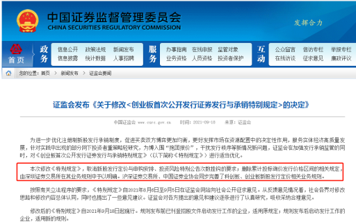 9月18日,证监会发布《关于修改<创业板首次公开发行证券发行与承销特别规定>的决定》。本次修改《特别规定》,取消新股发行定价与申购安排、投资风险特别公告次数挂钩的要求;删除累计投标询价发行价格区间的相关规定,由深圳证券交易所在其业务规则中予以明确。