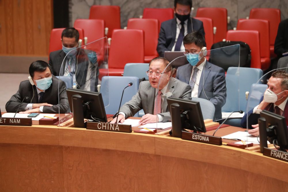 9月27日,在位于纽约的联合国总部,中国常驻联合国代表张军(中)在安理会《全面禁止核试验条约》问题公开会上发言。(新华社记者谢锷摄)