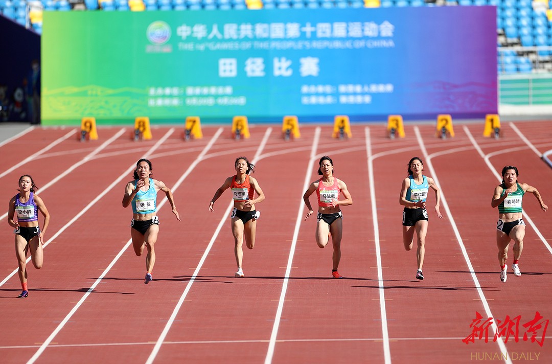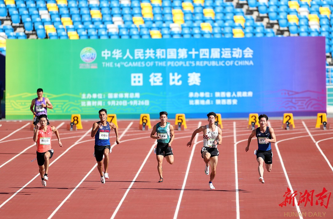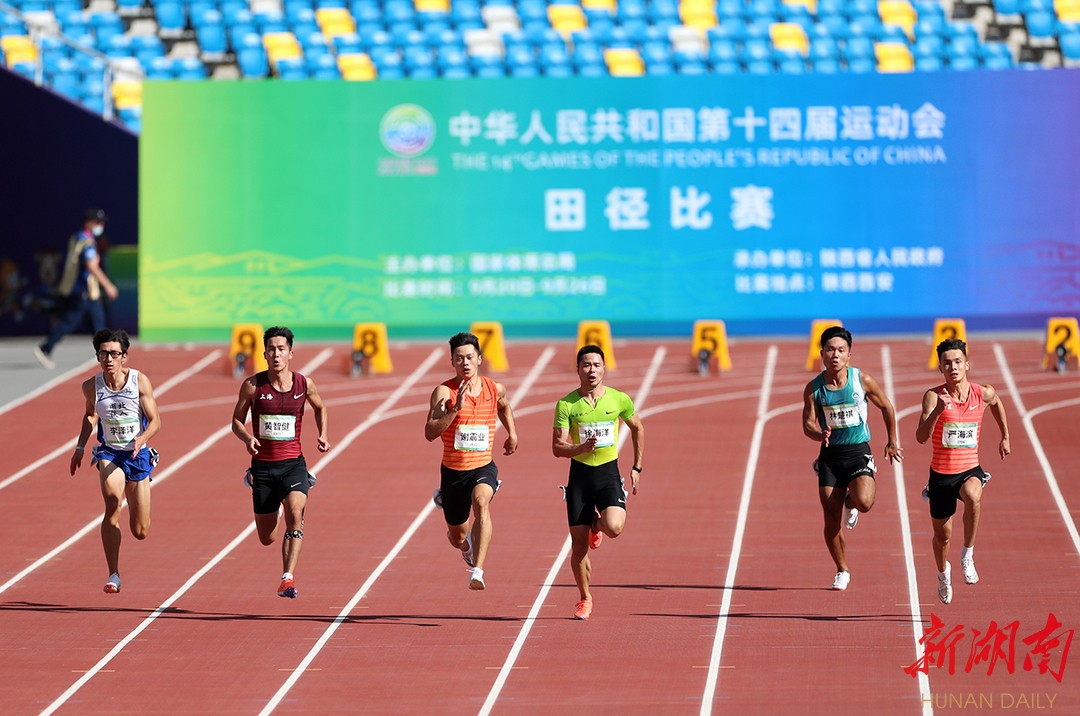 新湖南客户端9月20日讯(记者 胡旻 通讯员 陈放)今日,第十四届全国运动会田径项目在西安奥体中心体育场开赛。今晚,全运会男子百米半决赛上演,在东京奥运会跑出9秒83的苏炳添不负众望,跑出10秒06的成绩,明日,将上演男子百米“飞人大战”。目前,体育湘军已有何珂、童曾欢两位运动员进入女子400米决赛;在女子三级跳和女子铁饼的决赛,也将彭梦媛和林傲雪出现体育湘军的身影。此外,体育湘军还将有运动员参加女子800米、男子4×200米接力、女子100米跨栏等项目的预赛。 (图为9月20日上午,苏炳添(右三)在男子百米预赛的比赛中。 陈放 摄)