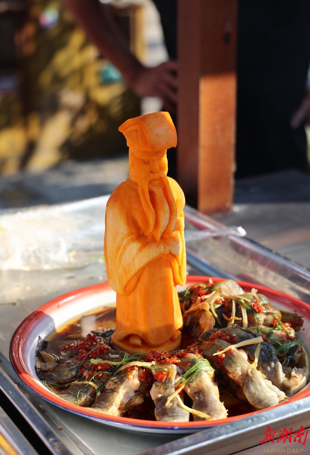 本次美食周活动共有桃花源40家餐饮单位参加,现场展示钵子菜、擂茶等百余种独具桃花源特色的美食和特产。除五柳营造社的4款文创美食外,各参展企业也推出了不少创意菜式,让人眼前一亮。白麟洲岛内亲农庄用三个黄金南瓜做成南瓜蒸肉,在餐桌上重现水府阁远眺的“三日同辉”奇景;菜品“黄闻镇妖”,将酱汁鲶鱼块绕盘摆成一圈,中间立着南瓜雕刻的道长,讲述道长黄闻与鲶鱼精搏斗,镇压妖怪的传说。“光雕刻道长就花了我1天时间。”农庄老板鄢云丽说。梧桐客栈则推出擂茶宴,番茄玫瑰、仙桃包子、五彩水晶鸡蛋……个个都有吉祥美好的寓意。