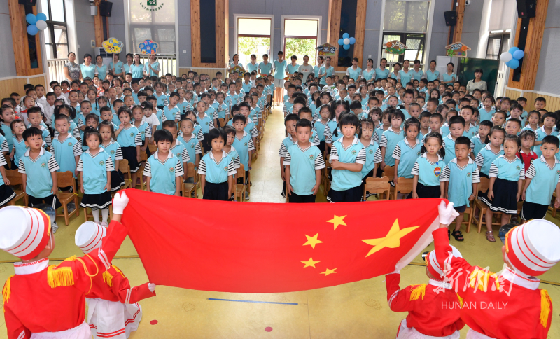 9月7日,幼儿园师生举行升国旗仪式。当天,长沙市开福区教育局山语城幼儿园开展以“少年强 中国强”为主题的开学第一课系列活动,在“感受成长”的情感教育中,将爱国主义润泽每一个幼小心田。湖南日报•新湖南客户端首席记者 郭立亮 通讯员 黎巾晖 摄影报道