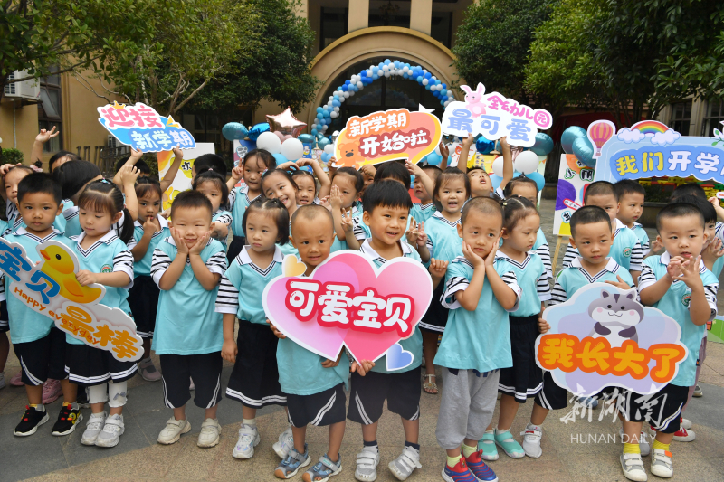 9月7日,开学第一天,孩子们开心地合影。当天,长沙市开福区教育局山语城幼儿园开学,举行“灿烂开学季 最美成长礼”新学期主题活动。湖南日报•新湖南客户端首席记者 郭立亮 通讯员 黎巾晖 摄影报道
