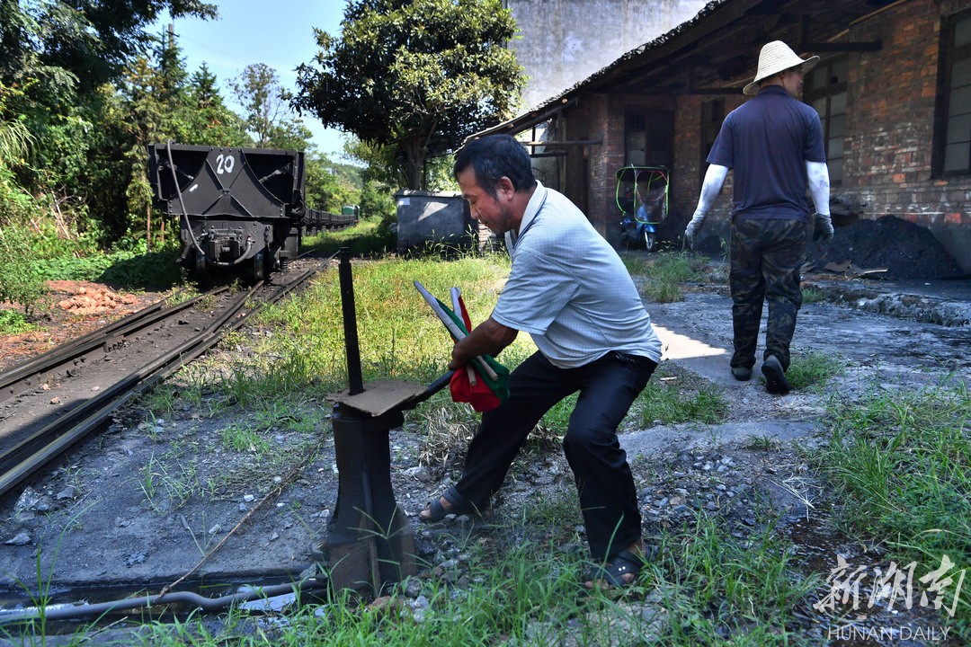 9月3日,永兴县马田镇江家车站,值班员张甲良扳开铁轨道岔,供火车转轨。