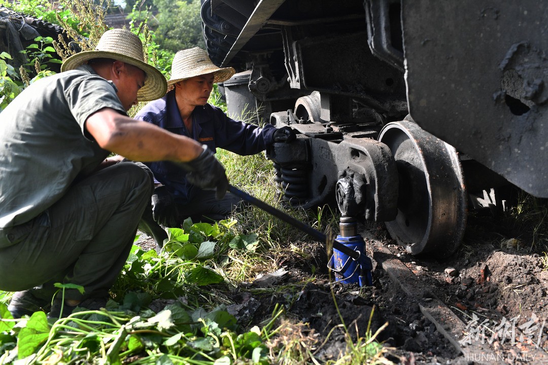 8月24日,火车在行驶过程中一节自卸车突然掉轨,司乘人员用千斤顶抬高车厢将车轮修正。因为车轮磨损严重和轨道线路问题,这种情况偶有发生。