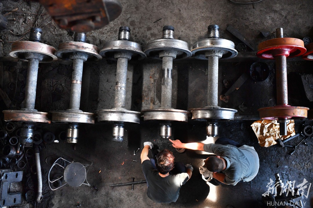 8月25日,机修人员在修理车间,对火车的车轴进行维修。