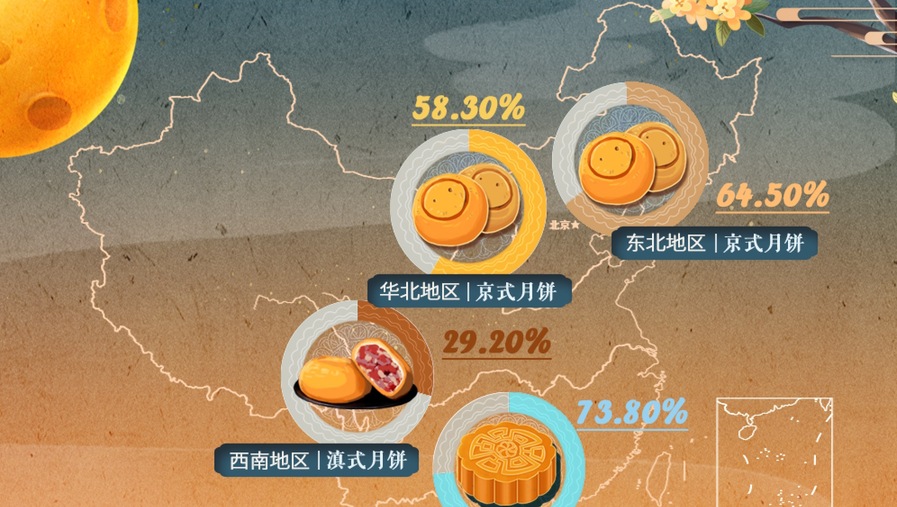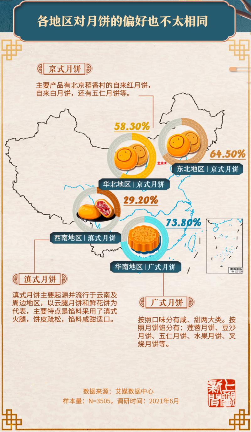 在华北地区与东北地区,喜爱京式月饼的消费者更多;华南地区是广式月饼的天下;而以云腿月饼和鲜花月饼为代表的滇式月饼,则在西南地区占有一片市场。