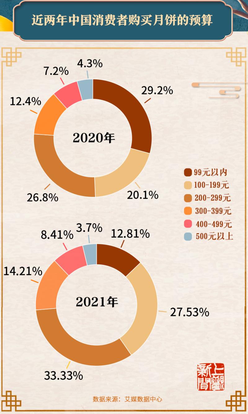 并且,国人对于月饼消费的预算也有所提高。今年近60%的消费者愿意花100至300元购买月饼,相比去年,预算在100至199元的占比提高了7.4%,预算在200-299元的占比也提高了6.5%。