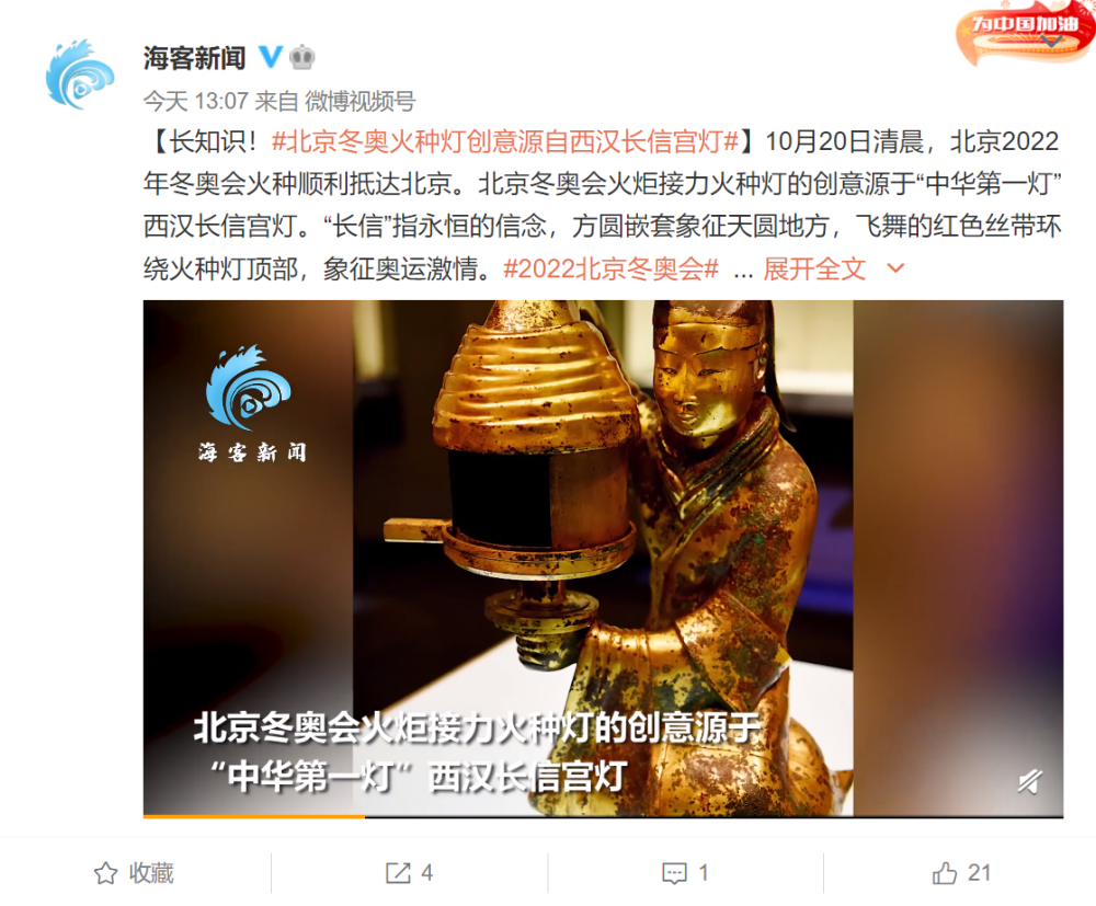 10月20日清晨,北京2022年冬奥会火种顺利抵达北京。北京冬奥会火炬接力火种灯的创意源于“中华第一灯”西汉长信宫灯。“长信”指永恒的信念,方圆嵌套象征天圆地方,飞舞的红色丝带环绕火种灯顶部,象征奥运激情。
