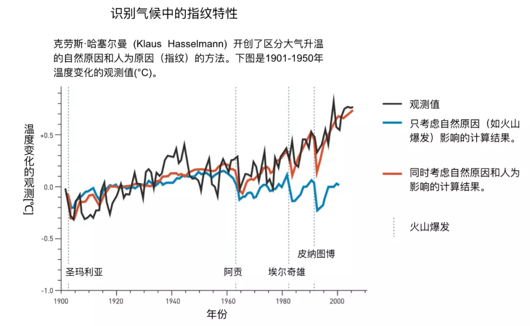 在建立了气候变化模型之后,哈塞尔曼就发展了识别人类对气候系统影响的方法。他发现,这些模型,连同观测和理论上的考虑,包含了有关噪声和信号特性的充分信息。例如,太阳辐射、火山颗粒或温室气体水平的变化会留下独特的信号,这些信号可以被分离出来,就像指纹。这种识别指纹的方法也可以应用于研究人类对气候系统的影响。哈塞尔曼因此为进一步研究气候变化扫清了道路,即利用大量独立观测结果找到了了人类对气候影响的痕迹。