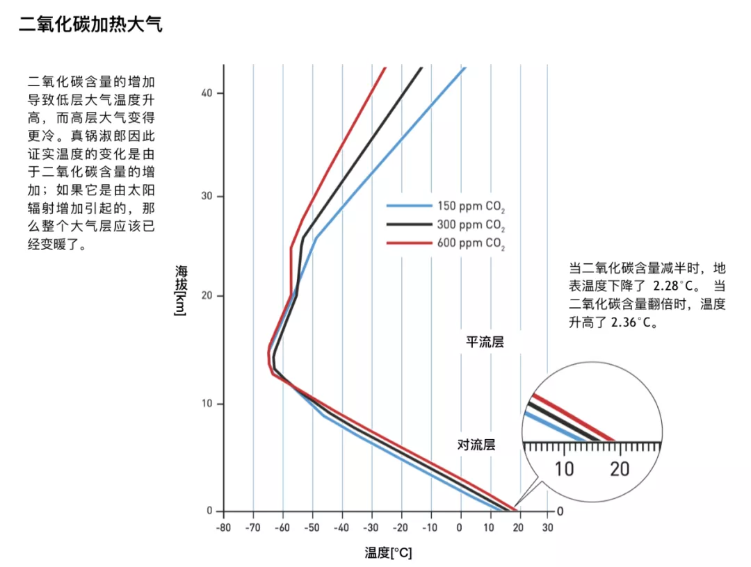 该模型证实,二氧化碳的增加确实会导致温度增加,模型预测:随着靠近地面,温度会升高,而远离地面,即在高层的大气层温度则会将降低。如果是由于太阳辐射导致的温度升高,那么整个大气层都应该同时被加热。