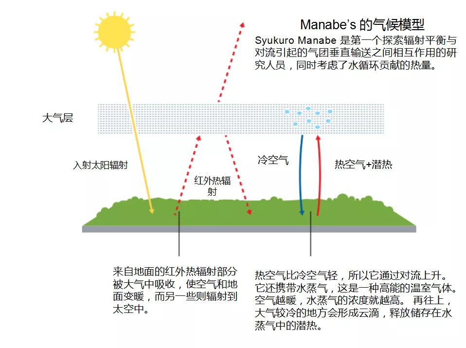 上世纪50年代,一些年轻有为的科学家离开了被战争破坏的东京,飘洋过海到美国继续他们的学术生涯,大气物理学家真锅淑郎便是其中之一。像阿伦尼乌斯在大概七十年前一样,真锅淑郎的研究目标之一便是理解二氧化碳浓度的提升如何导致温度的上升。然而,当阿伦尼乌斯将重点聚焦于辐射平衡时,在上世纪60年代,真锅淑郎主导的工作着重在发展大气物理模型,模型包括对流导致的气团垂直输运,以及水蒸汽的潜热。
