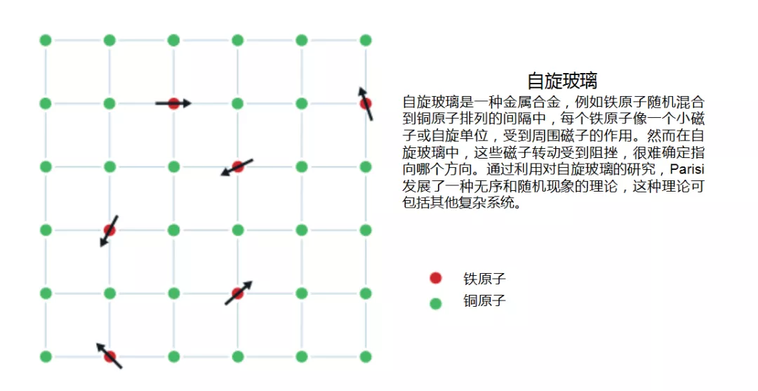 这些小球可以看做一般的玻璃和颗粒材料(如沙子或者砾石)的简化模型。然而,帕里西最初研究的是一种不同的系统——自旋玻璃,这是一种特殊的金属合金,例如,在铜原子中随机混合铁原子,虽然只有少量的铁原子,但是它们以一种极端而又令人费解的方式改变了材料的磁性。铁原子就像一个小磁针或者自旋,被其附近的铁原子影响。一般的磁体中,所有的自旋都指向同一个方向,但在自旋玻璃中这些是阻挫的。一些自旋配对偏向于指向于同一方向,而另一些自旋偏向于指向相反的方向,所以如何找到它们最优的排列呢?