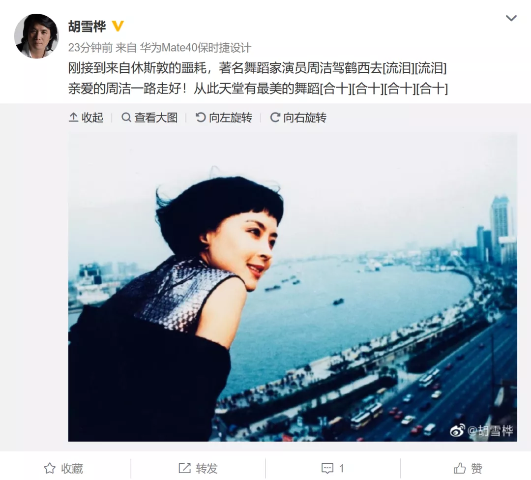 10月3日8时许,据导演@胡雪桦称,“刚接到来自休斯敦的噩耗,著名舞蹈家演员周洁驾鹤西去。亲爱的周洁一路走好!从此天堂有最美的舞蹈。”