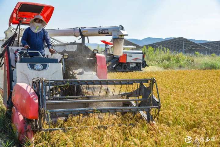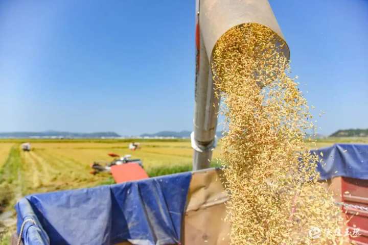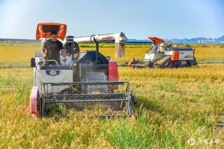 收割现场,4台小型水稻收割机共同作业,穿梭在金黄的稻田间,切割、脱粒、粉碎秸秆等工序一气呵成。十几分钟,一块稻田便收割完毕,稻谷随后被卸载到路边的货车里。